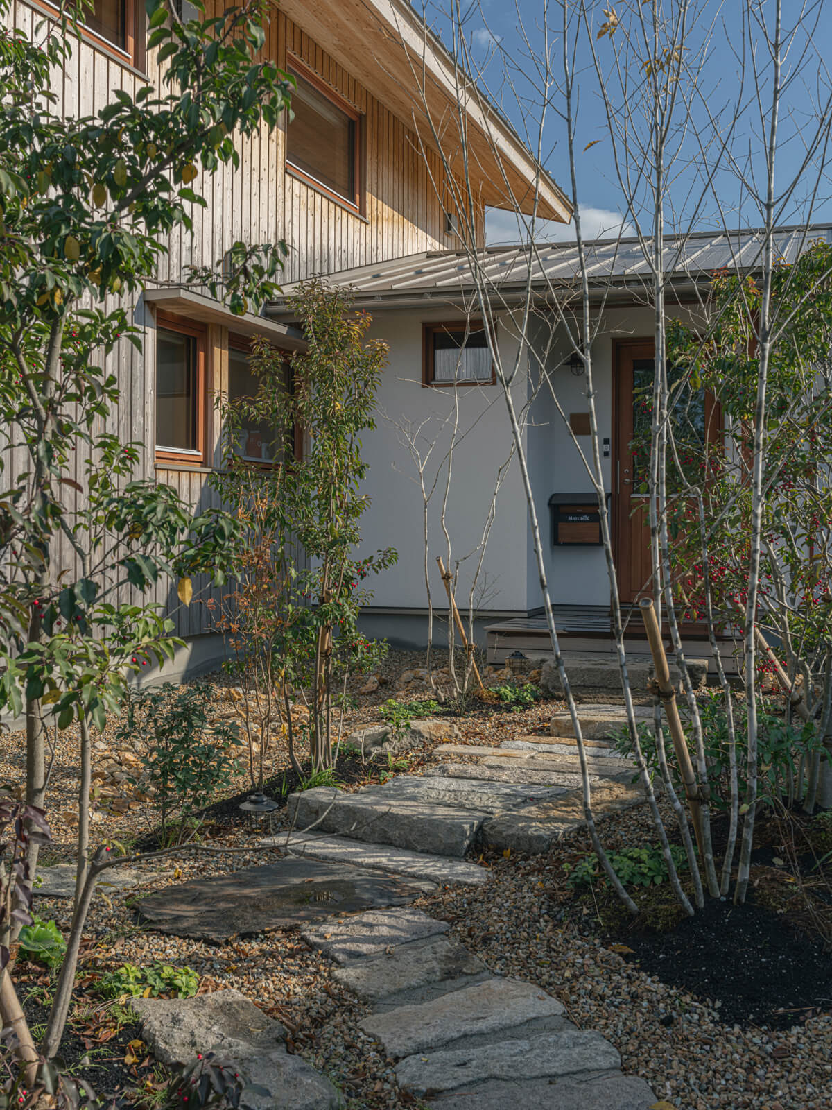 プライバシーも考え玄関の中は外からも見えるが家の中までは見えない配置とした。