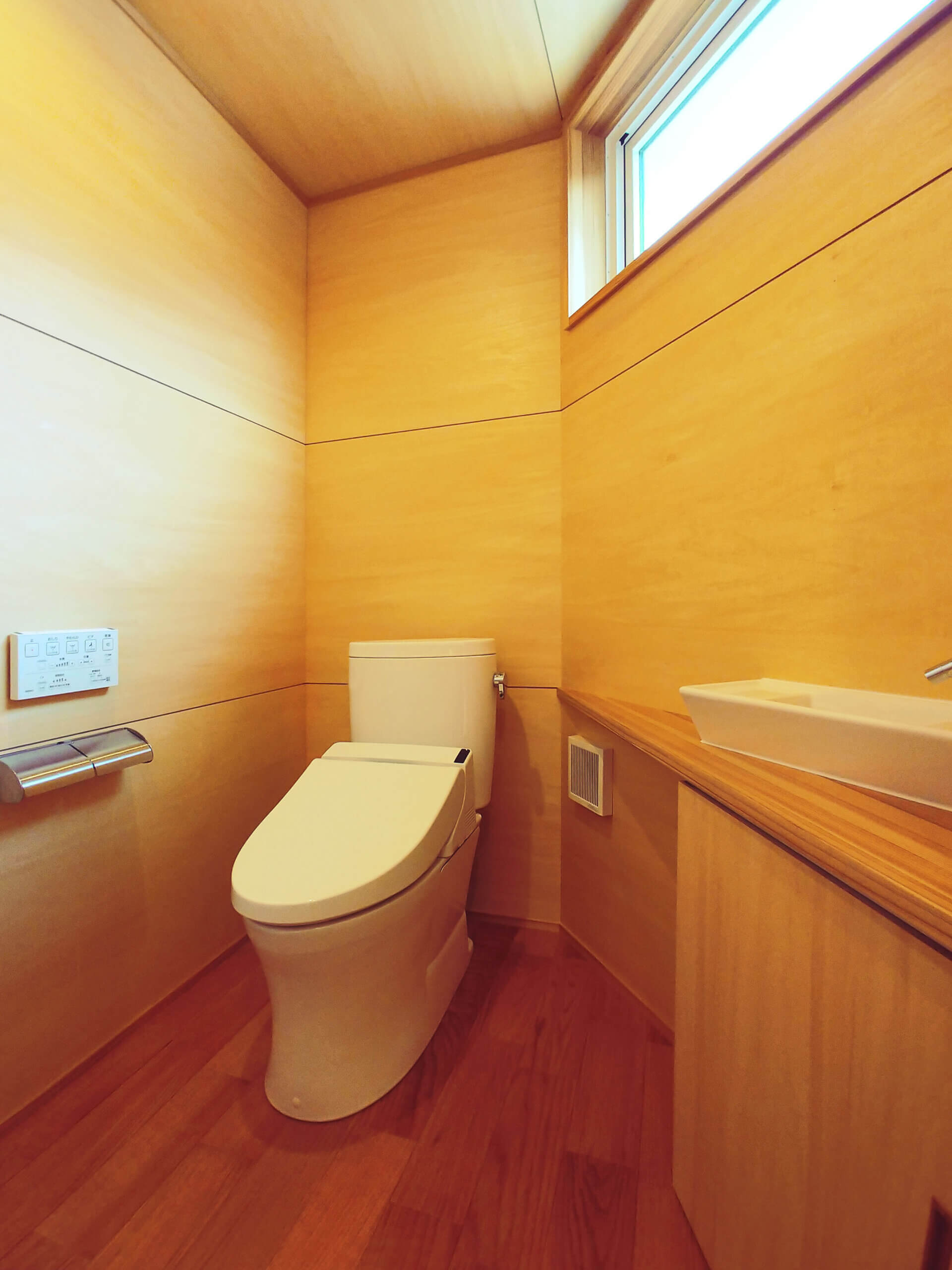 このお宅は特殊な敷地状況から斜めにしたことで、狭くなくより使いやすく、プライバシー保てる位置に窓を作り、明るく気持ちいトイレとなりました。